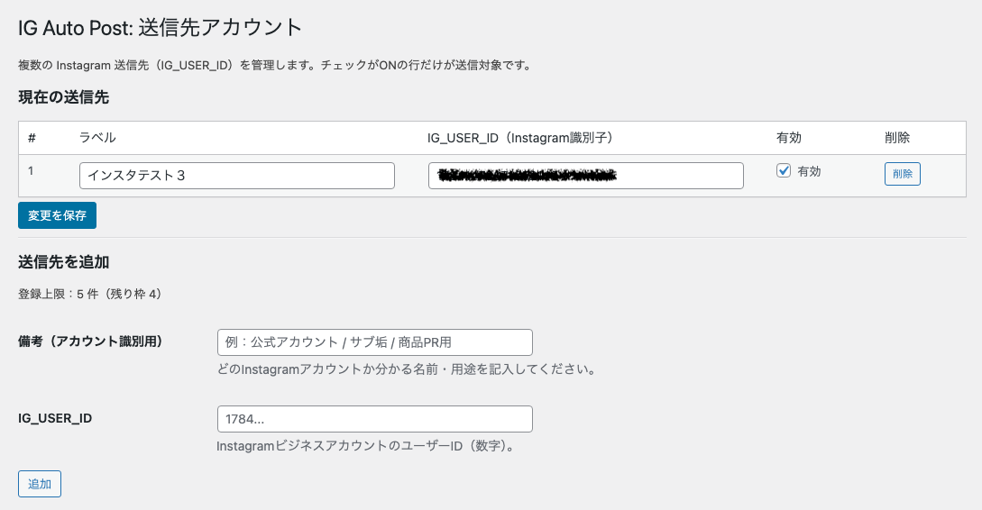 ・IG Auto Post: 送信先アカウント:Instagram識別子を登録します。